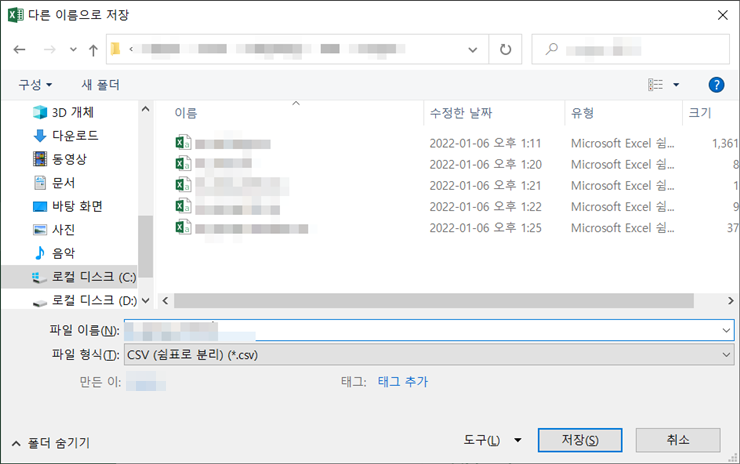 "이 형식을 계속 사용하시겠습니까?"에서 아니요를 누르면 다른 이름으로 저장 창이 또 뜨는데요. 여기서 취소를 눌러 창을 닫습니다. 이미 csv 파일은 저장한 상황이니 상관없습니다.