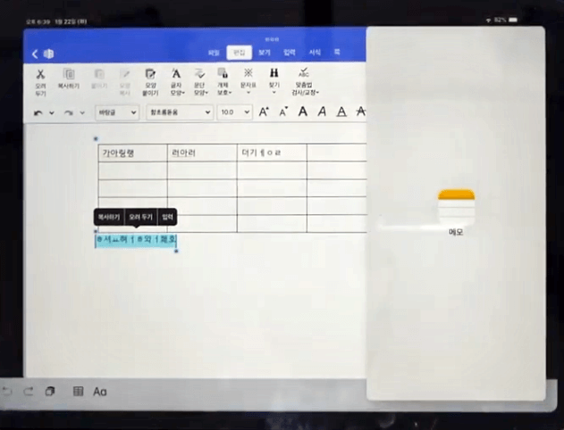한컴오피스에서는 멀티태스킹 창을 불러올 수는 있지만, 제스처를 통해서 화면을 분할하는 건 불가능합니다. 최적화가 안 되어 있는 문제라고 봅니다.