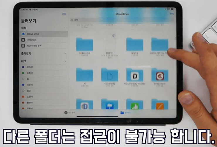 "내문서 - 아이클라우드 드라이브"로 이동하면 폴더 내부를 볼 수 있는데요. 여기서 말하는 폴더란 아이패드 파일 폴더 안에 있는 한컴오피스 폴더입니다. 문제는 한컴오피스 앱은 한컴오피스 폴더 딱 하나만 접근할 수 있습니다. 즉, 아이패드 한컴오피스 앱에서 접근할 수 있는 폴더는 한컴오피스 폴더 딱 하나뿐이라는 겁니다.