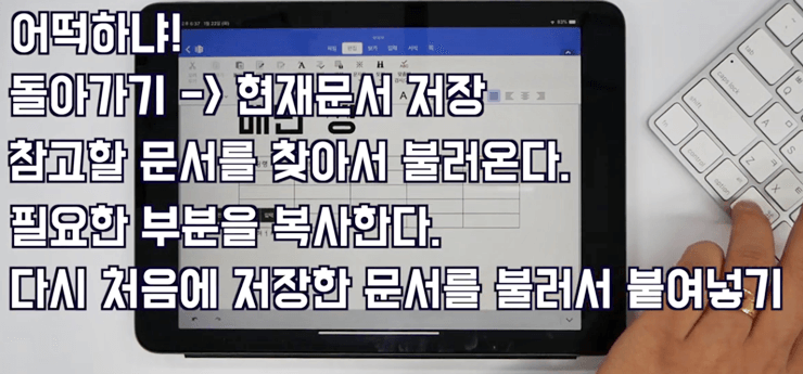 한글 문서 작성할 때 보고서 같은 경우엔 하나의 파일만 열어서 작업할 수 있지만, 공문을 본다든지 다른 파일을 참고할 때 여러 개의 창을 띄워야 합니다. 근데, 아이패드 한컴오피스 앱에선 여러 창을 띄우는 게 불가능합니다. 그럼, 다른 문서를 참고하려면 어떻게 해야 하느냐?