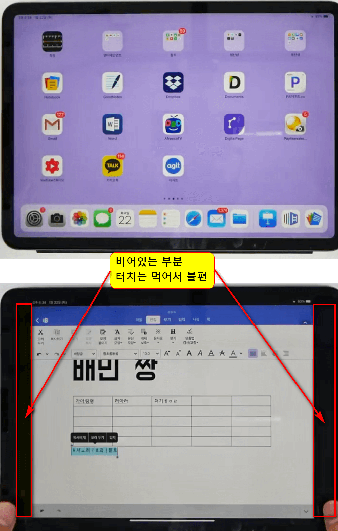 아이패드는 상하좌우 베젤이 균일합니다. 아이패드 앱들도 아이패드 화면을 100% 사용하고 있지만, 아이패드 한컴오피스 앱은 화면이 맞지 않고 좌우에 빈 부분이 생깁니다. 화면은 검은색으로 비어있지만 웃기게도 터치는 먹습니다. 민감한 분들은 신경이 많이 쓰일 수밖에 없습니다.