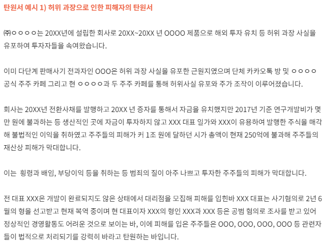 전 대표 XXX은 개발이 완료되지도 않은 상태에서 대리점을 모집해 피해를 입힌바 XXX 대표는 사기혐의로 2년 6월의 형을 선고받고 현재 복역 중이며 현 대표이자 XXX의 형인 XXX과 XXX 등은 공범 혐의로 조사를 받고 있어 정상적인 경영활동도 어려운 것으로 보이는 바, 이에 피해를 입은 주주들은 OOO, OOO, OOO, OOO 등 관련자들이 법적으로 처리되기를 강력히 바라고 탄원하는 바입니다.