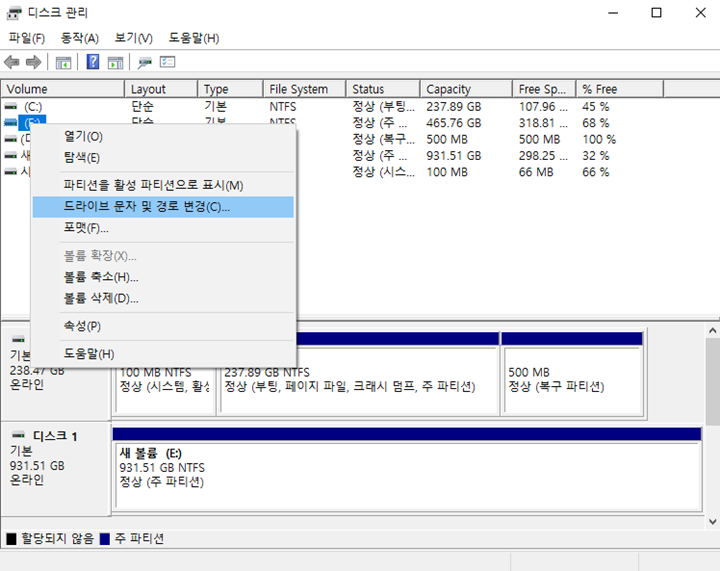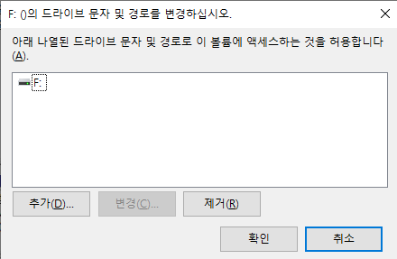 디스크 관리에서 드라이브 문자를 할당