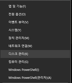 단계 1 : Windows 시작 버튼을 마우슨 오른쪽으로 클릭하고 메뉴에서 "디스크 관리"를 클릭합니다.