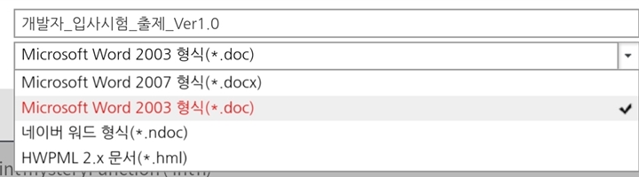워드 파일 한글로 변환 시 : HWPML 2x 문서(*.hml) 선택(그림 참조)