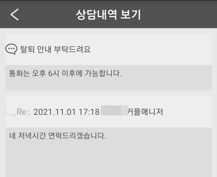 담당매니저 상담 시, 보통은 매칭 매니저, 커플 매니저에게 글을 남기는데요. 가연 환불이 늦어지니 저는 커플 총괄팀장에게 또 탈퇴 상담 글을 남겼습니다. 그리고 다음날 바로 고객센터 전화를 받고 환불 금액이랑 시기를 안내받았네요.