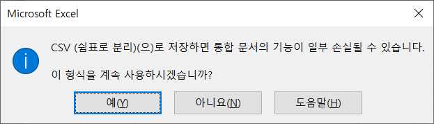 CSV로 저장하면 뭔가 손실된다는데 아니요를 누릅니다.