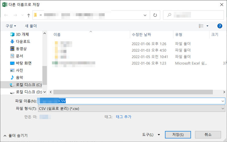 "이 형식을 계속 사용하시겠습니까?"에서 아니요를 누르면 다른 이름으로 저장 창이 또 뜨는데요. 여기서 취소를 눌러 창을 닫습니다. 이미 csv 파일은 저장한 상황이니 상관없습니다.