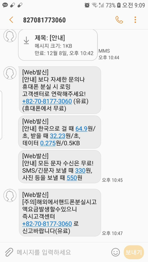그리고, 알뜰폰으로 한국에서 보내는 문자 확인해도, MMS 문자를 열어도, 별도의 요금을 내지 않아도 됩니다. 자세히 기억은 안 나는데 MMS 문자 열어도 돈 안 나간다는 내용을 통신사 사이트에서 확인해보셨다고 하네요. 그래도 찝찝하다면, 개인 부가서비스 항목에서 로밍 차단시켜놓고 사용해도 됩니다.