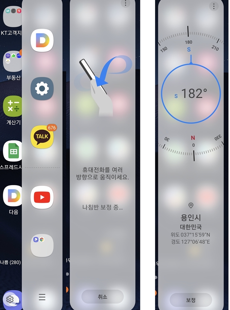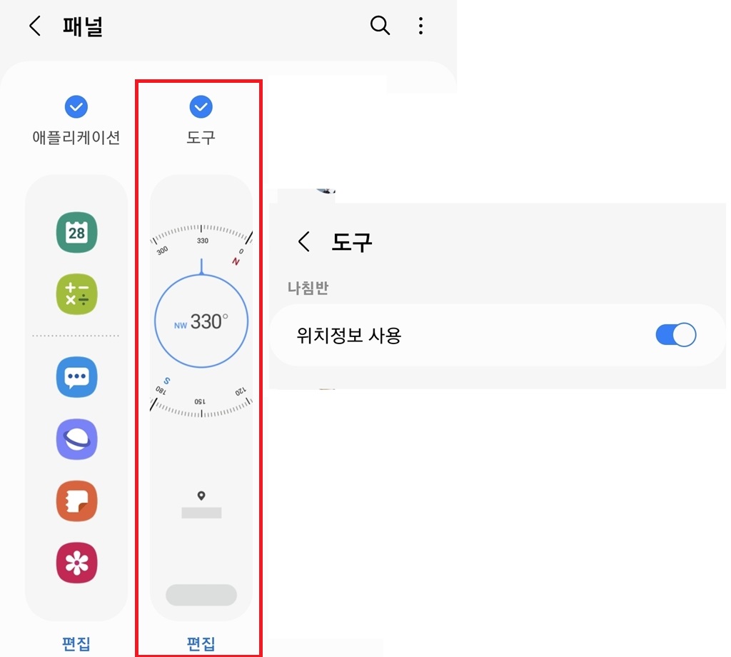 엣지 패널을 오른쪽, 왼쪽으로 넘기면 다른 메뉴를 볼 수 있어요. 도구 나침판을 새로 추가하였다면, 오른쪽으로 엣지 패널을 넘겨 나침반을 확인해 보세요. 잘 보인다면 핸드폰으로 나침반 보는 법 완료가 된 것입니다.