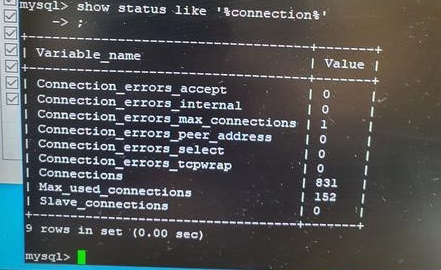 명령어 show status like '%connections%' 를 이용해 우선 현재 상태를 확인합니다.