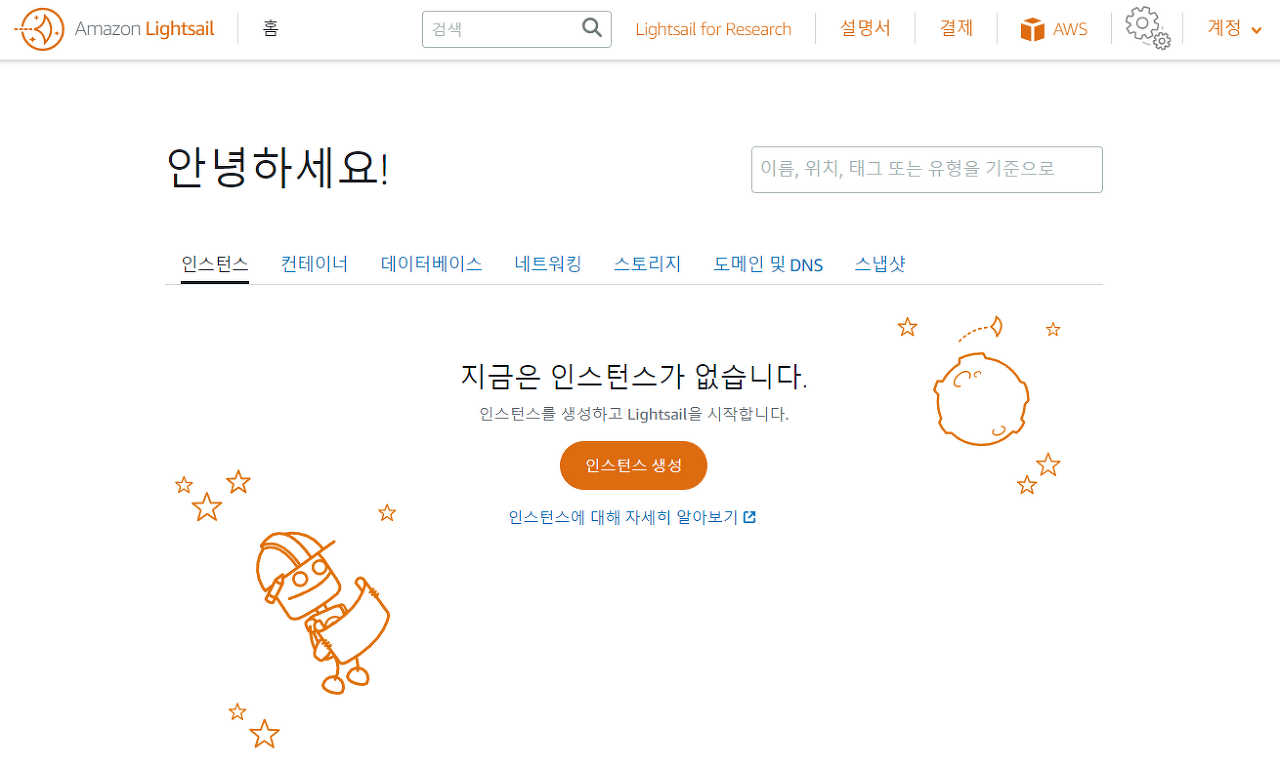 먼저 AWS Lightsail에 접속하셔서 가입한 후, 서버를 생성합니다.