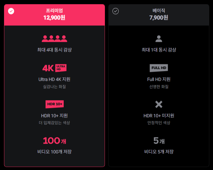 화질 차이도 좀 나기 때문에 TV에 연결해서 보면 베이직 요금제는 살짝 아쉬울 수도 있고요. 이런게 민감하신 분들은 프리미엄 요금제를 사용하시는게 좋을것같습니다.