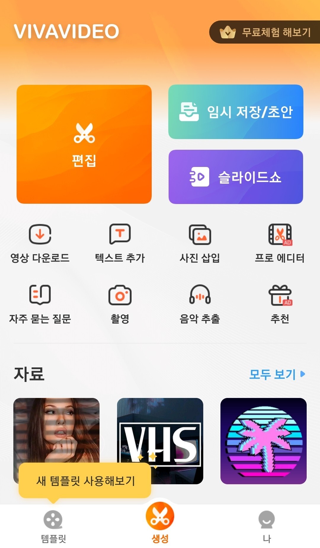 먼저 비바비디오 편집, 임시 저장/초안, 슬라이드 쇼, 영상 다운로드, 텍스트 추가 등 다양한 버튼들이 있는 것을 볼 수 있습니다. 아무래도 가장 많이 사용하게 될 기능은 편집 기능이 되지 않을까 싶네요. 저 또한 동영상 편집 어플에서 가장 많이 사용하는 기능이기도 합니다.