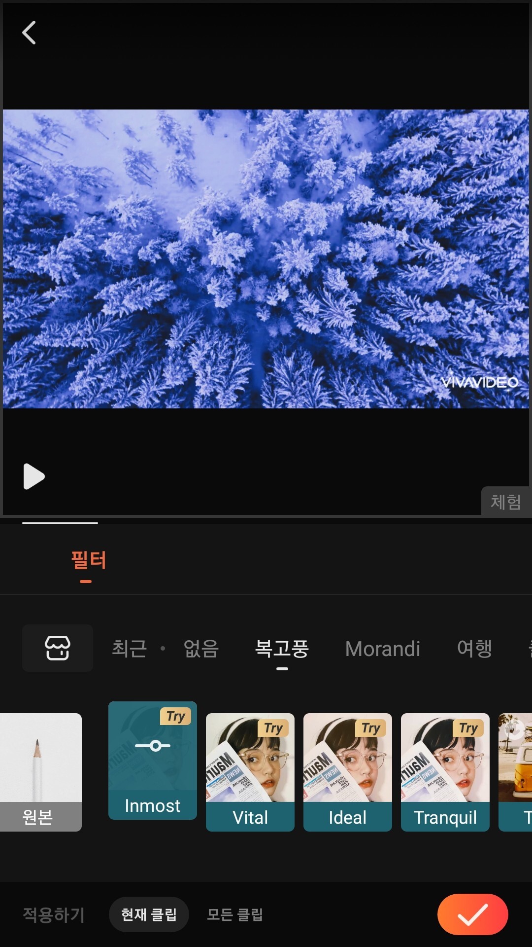 동영상 편집 어플 비바비디오에서도 필터 기능은 사용이 가능한 것으로 확인됩니다. 그러나 유료버전으로 사용할 경우 더 폭넓은 필터 기능을 이용할 수 있습니다. 영상을 조금 더 분위기 있게 만들기 위해서라면 그 영상에 맞는 필터를 적용하여 동영상 편집의 완성도를 높일 수 있을 것으로 보입니다.