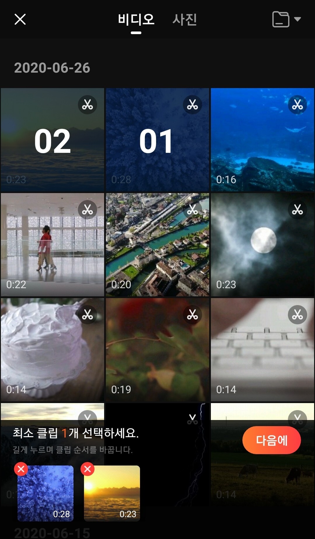 편집을 터치 후 원하는 영상을 고르시면 됩니다.