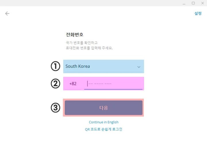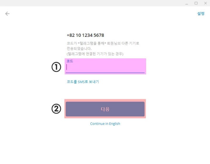 12. 1번 활성화 코드는 고객님의 휴대전화로 문자가 발송됩니다. [국외발신]으로 문자가 오면 뒤에 코드번호를 입력합니다. 예) [국외발신] Telegram code 12345 -> 코드입력란에 12345 입력 단, 문자가 안왔을 경우 차단문자 확인 또는 아래 그림처럼 문자가 아니라 기존에 등록한 텔레그램으로 발송될수 있으니 유의하시기 바랍니다. 아래그림처럼 코드입력란 밑에 ‘코드를 sms로 보내기’가 있으면 클릭하여 sms로 코드를 받을 수 있습니다. 2번 ‘다음’ 버튼 클릭