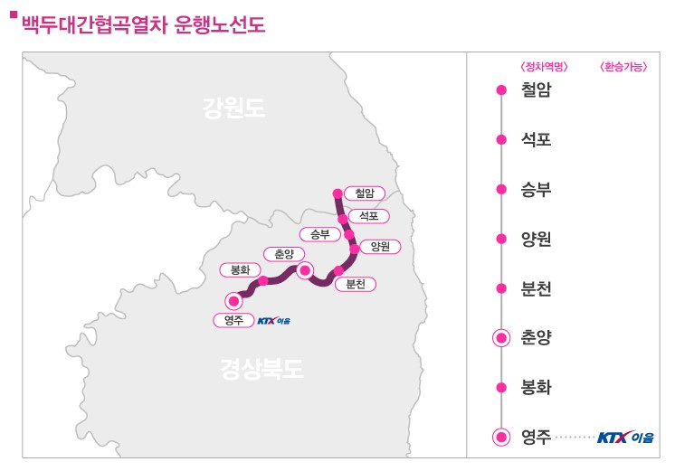 (철암-석포-승부-양원-분천) 특히 승부~분천 코스는 낙동강을 끼고 열차가 달리는 지역이라 차창을 통해 멋진 경관을 자랑한답니다. 겨울에는 눈과 함께, 다른 계절은 녹음의 푸르름을 볼 수 있는 코스예요.