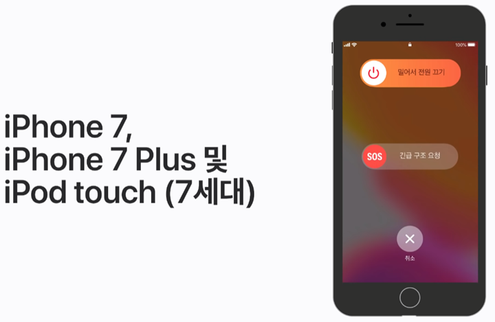 iPhone 7, iPhone 7 Plus 및 7세대 iPod touch에서는 전원 끄기 슬라이더가 표시될 때까지 측면 버튼이나 상단 버튼을 길게 누른 후 기기를 끕니다.