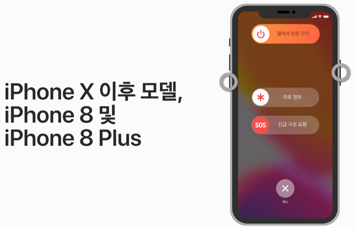 iPhone X 및 이후 모델, 그리고 iPhone 8과 iPhone 8 Plus에서는, 전원 끄기 슬라이더가 표시될 때까지 측면 버튼과 음량 버튼 하나를 길게 누르세요. 슬라이더를 드래그해서 기기를 끕니다.