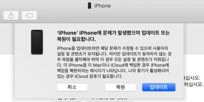 이제 아이폰 비활성화 푸는법을 위해 기기를 초기 설정으로 되돌리는 방법을 알려드릴게요. 기기에 나의 찾기가 켜져 있다면, Apple ID 암호를 알고 있어야 합니다. 기기를 복원하거나 업데이트할 수 있는 옵션이 표시됩니다.